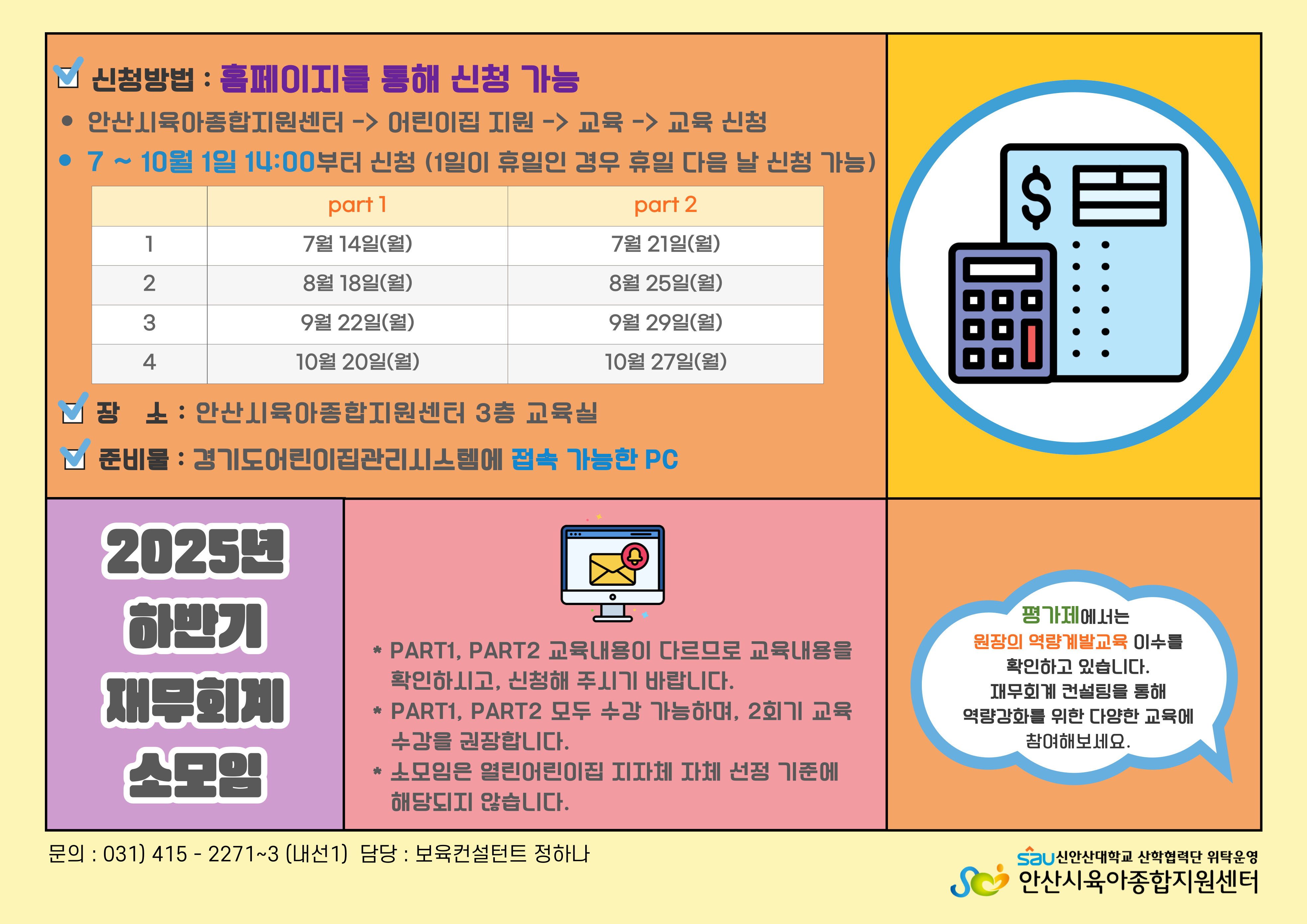 1차 소모임과 연계된 회계관리, 아동관리 / 교직원 관리 / 물품관리 중심으로 진행됩니다.