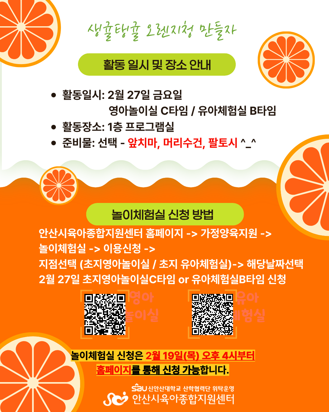 신청방법: 홈페이지->가정양육지원->놀이체험실->이용신청->영아놀이실 2월 27일 금요일 C타임&유아체험실 2월 27일 금요일 B타임으로 신청