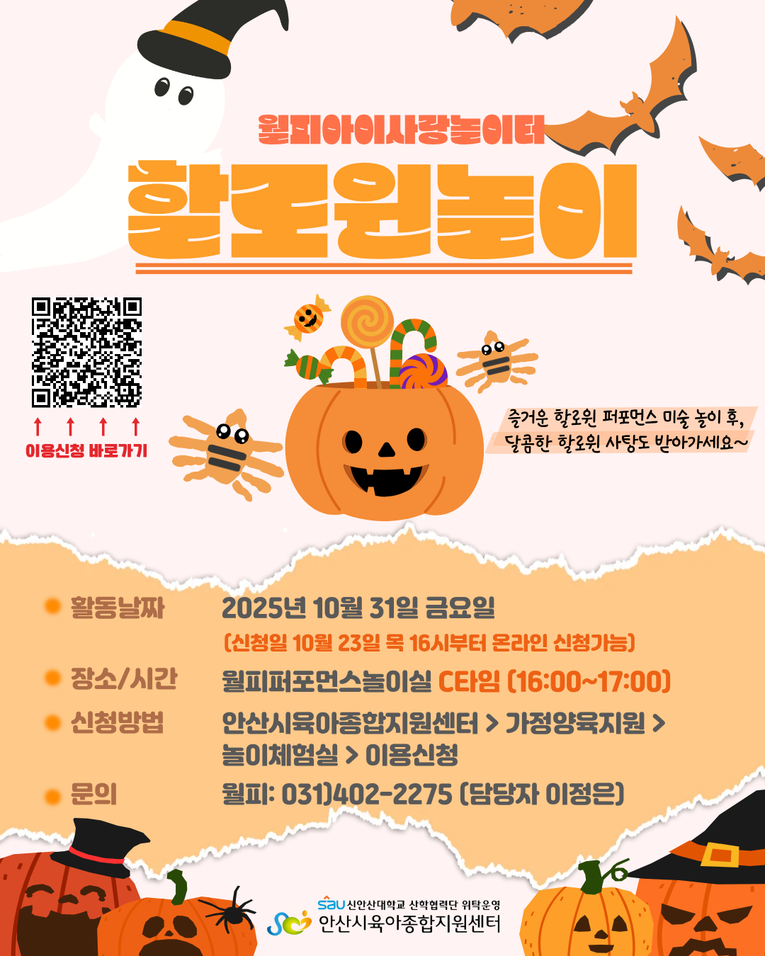 신청방법: 홈페이지->가정양육지원->놀이체험실->이용신청->월피점 퍼포먼스놀이실 10월 31일 금요일C타임