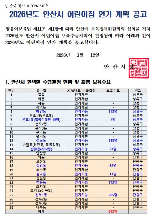 [안산시] 2026년도 보육수급계획 결정에 따른 안산시 어린이집 인가 계획 공고
