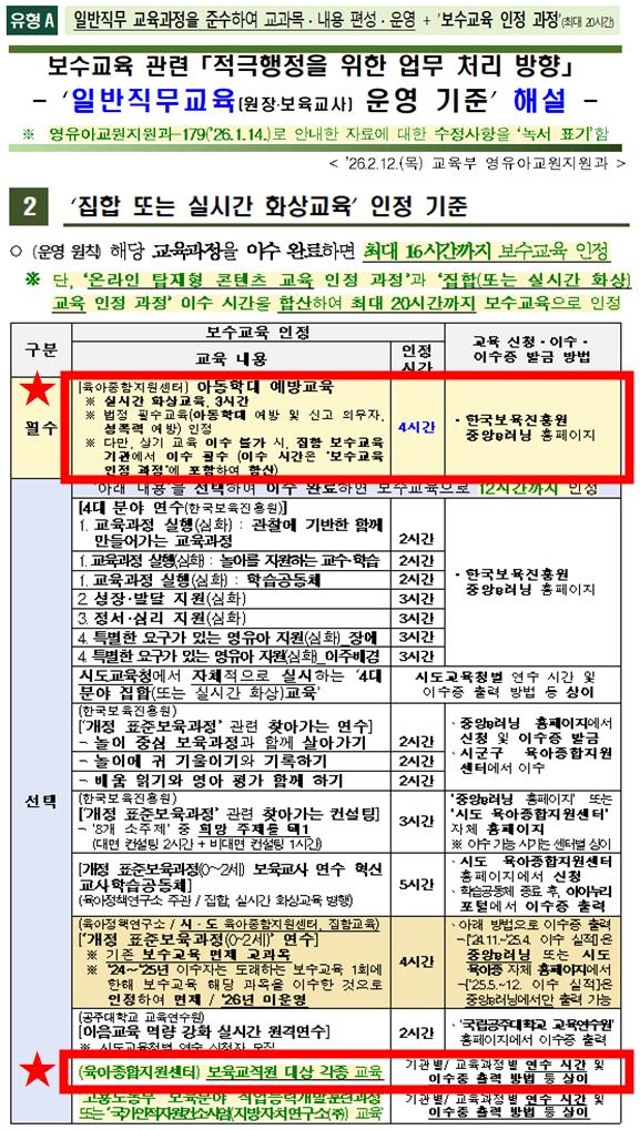보수교육 관련 일반직무교육 운영 기준(유형A)을 다음과 같이 안내드립니다.