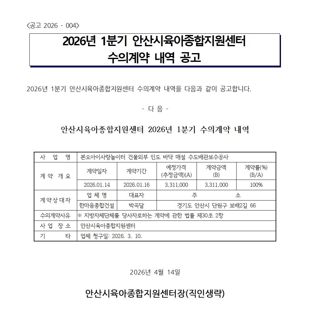 [안산시] [안산시육아종합지원센터] 2026년 1분기 수의계약 내용 공고