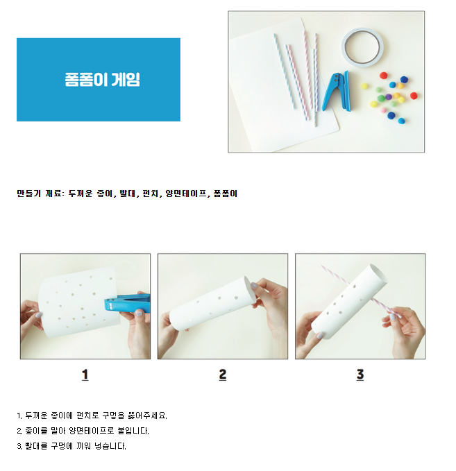 폼폼이와 빨대를 이용해 신나는 게임을 해보세요. 영아, 유아 모두에게 즐거운 놀이가 됩니다.