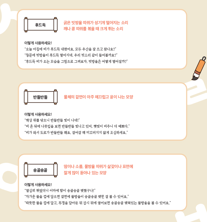 이달에는 '후드득 / 반들반들 / 송골송골' 단어의 뜻과 활용 문구에 대해 알아봅니다.
