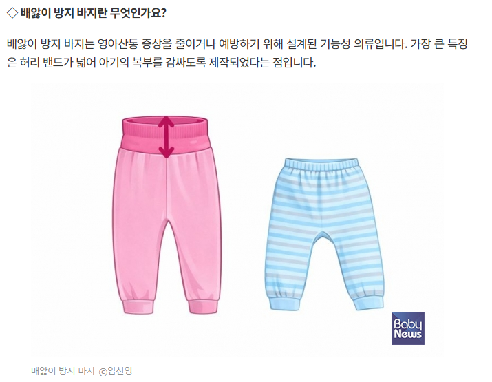 부모님들께서 외래에서 자주 질문하시는 물품 중 하나가 ‘배앓이 방지 바지’, 혹은 ‘영아산통 예방 바지’입니다. 겉보기에는 일반 바지와 큰 차이가 없어 보이지만, 허리 밴드 구조를 강조하며 영아산통 완화에 도움이 된다고 소개되는 경우가 많습니다. 과연 근거는 어떠한지, 전문의의 시선에서 정리해 보겠습니다.
