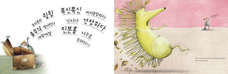 낱말 마법을 부리는 주인공 ‘오스카’. 오스카가 낱말 상자에서 ‘샛노랗다’를 꺼내 던지자 그 낱말에 맞은 고슴도치가 샛노랗게 변한다.