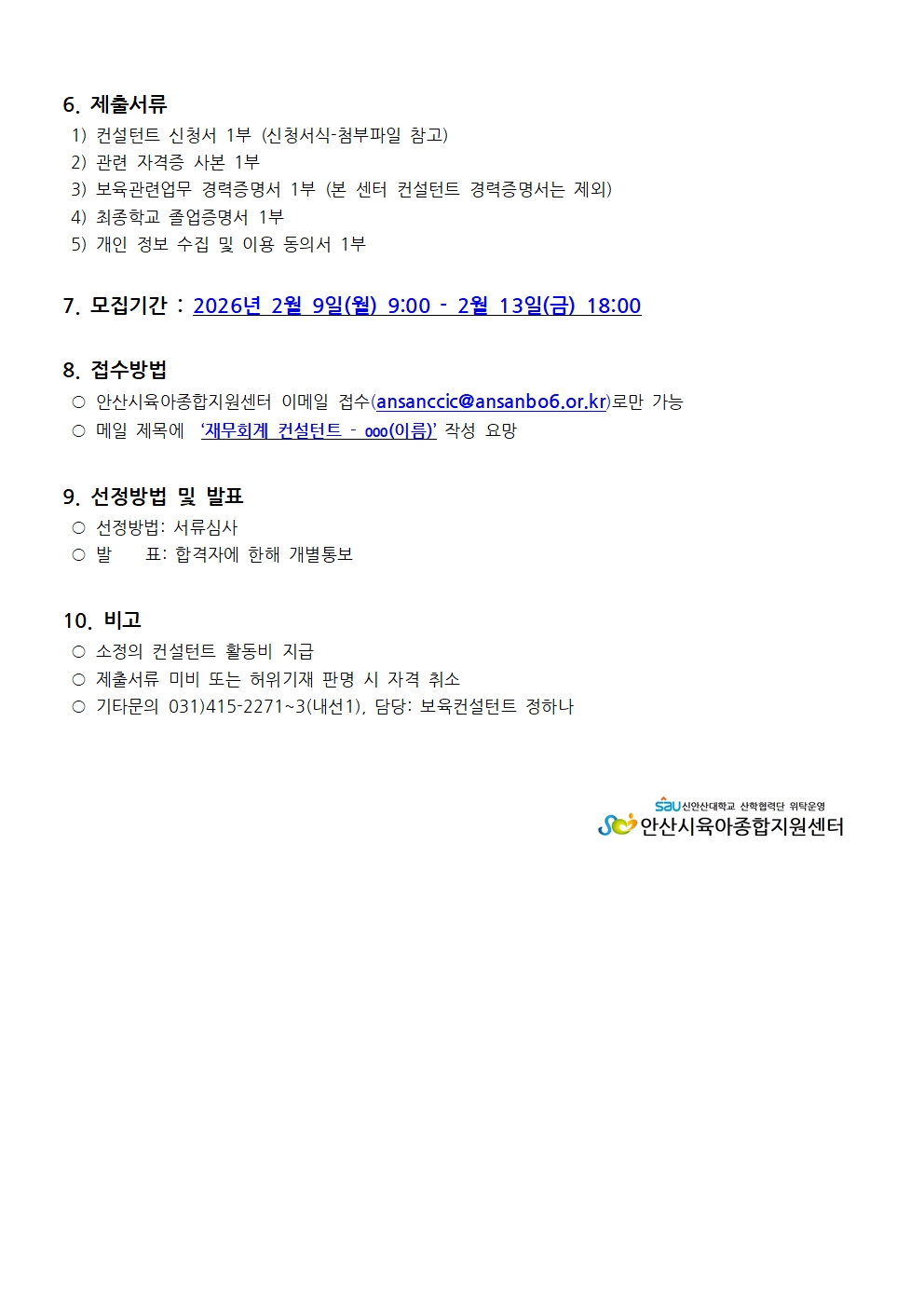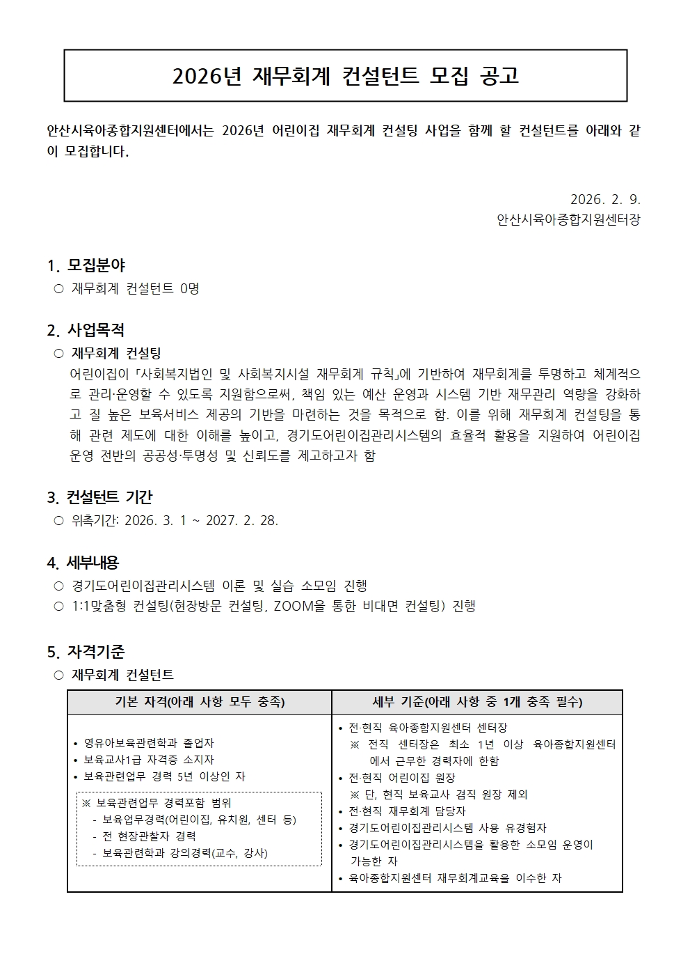 [안산시육아종합지원센터] 재무회계 위촉컨설턴트 모집 공고