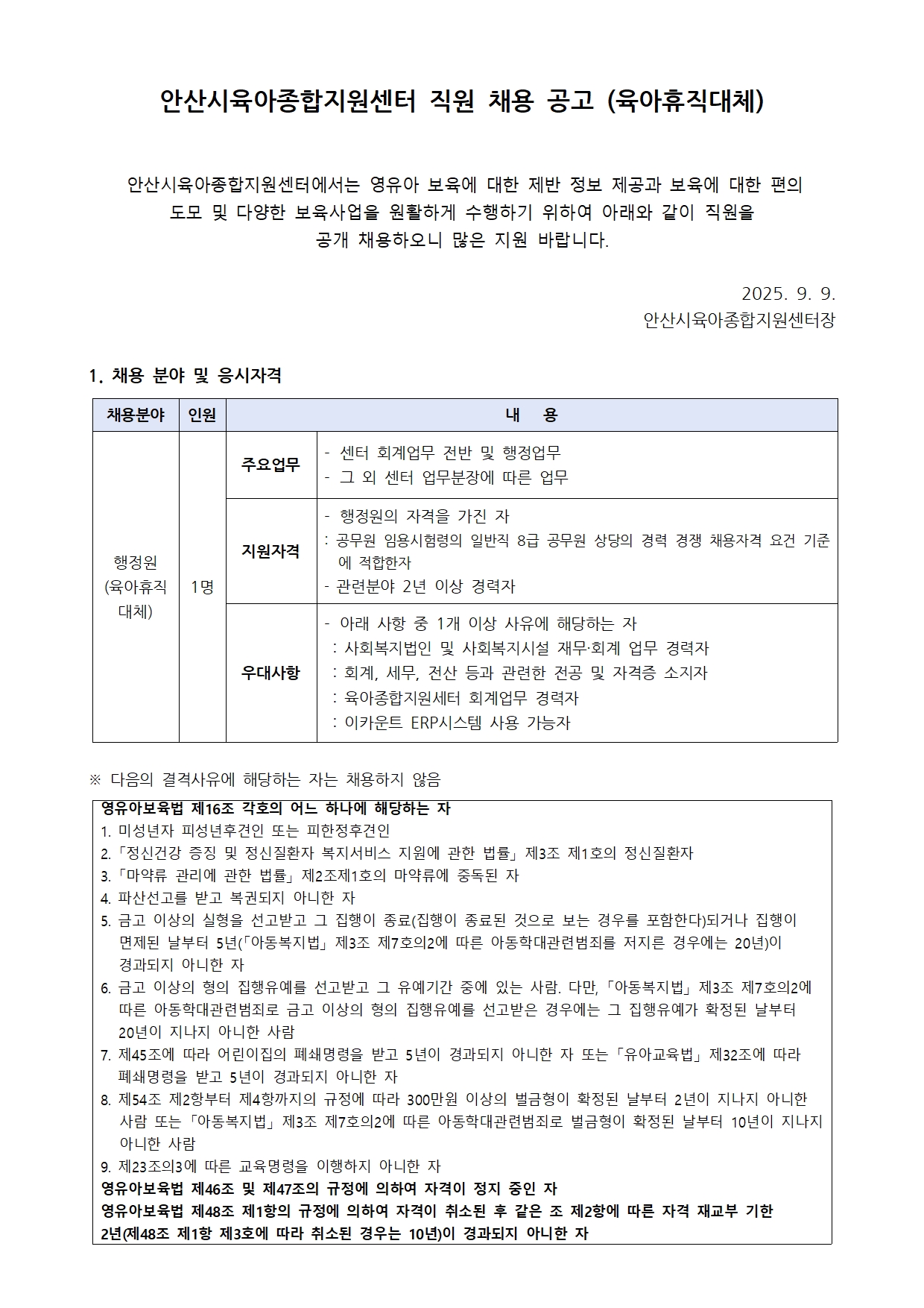 [안산시육아종합지원센터] 직원 채용 공고