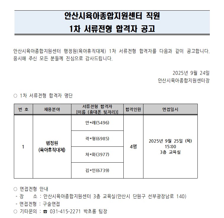 [안산시육아종합지원센터] 직원(행정원) 1차 합격자 발표