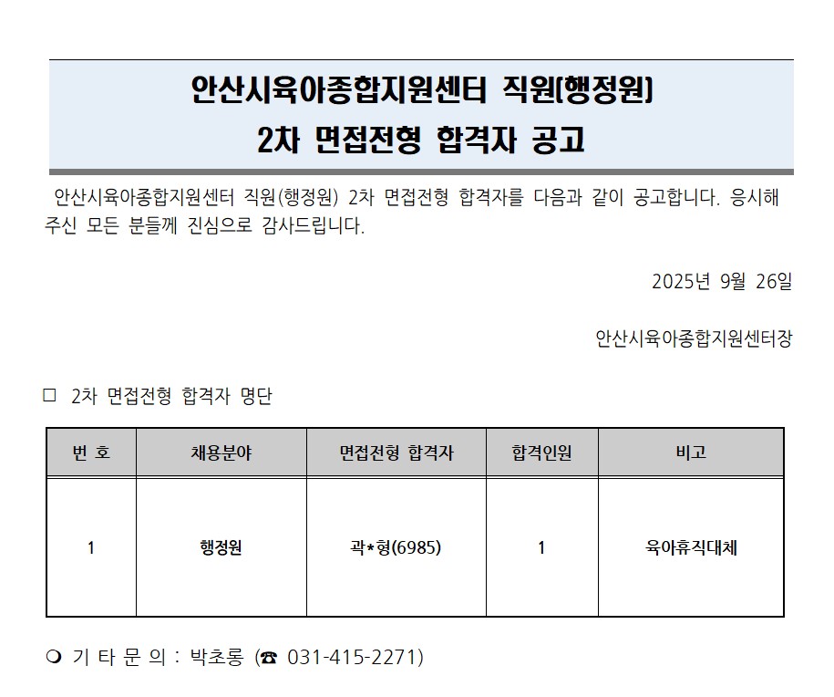 [안산시육아종합지원센터] 직원(행정원) 최종합격 공고