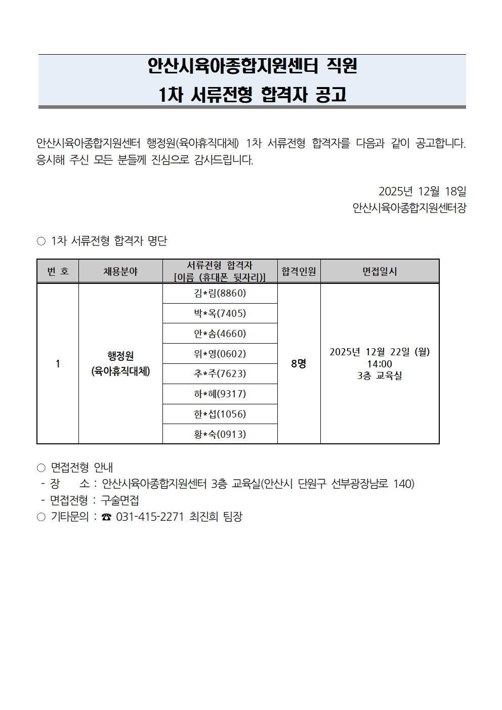 [안산시육아종합지원센터] 직원(행정원) 1차 합격자 발표