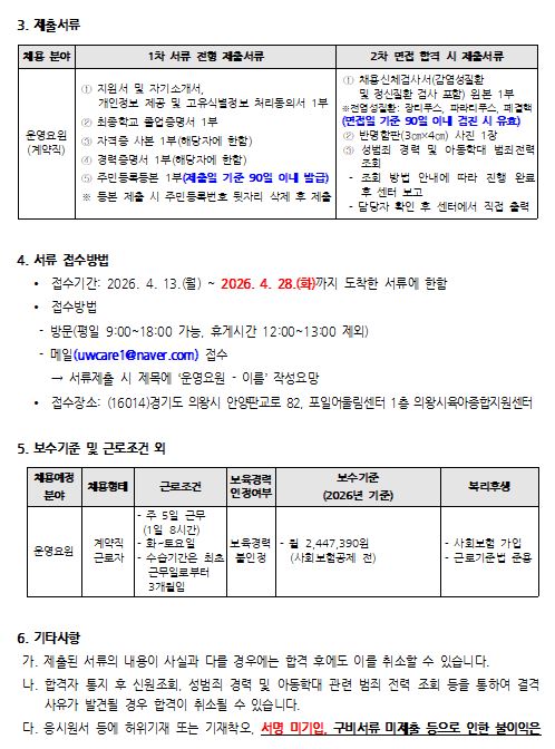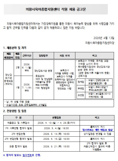 [의왕시육아종합지원센터] 직원 채용 공고(장난감도서관 운영요원)
