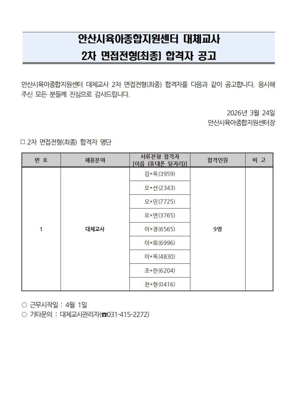 [안산시육아종합지원센터] 대체교사 2차 면접전형 합격자 공고