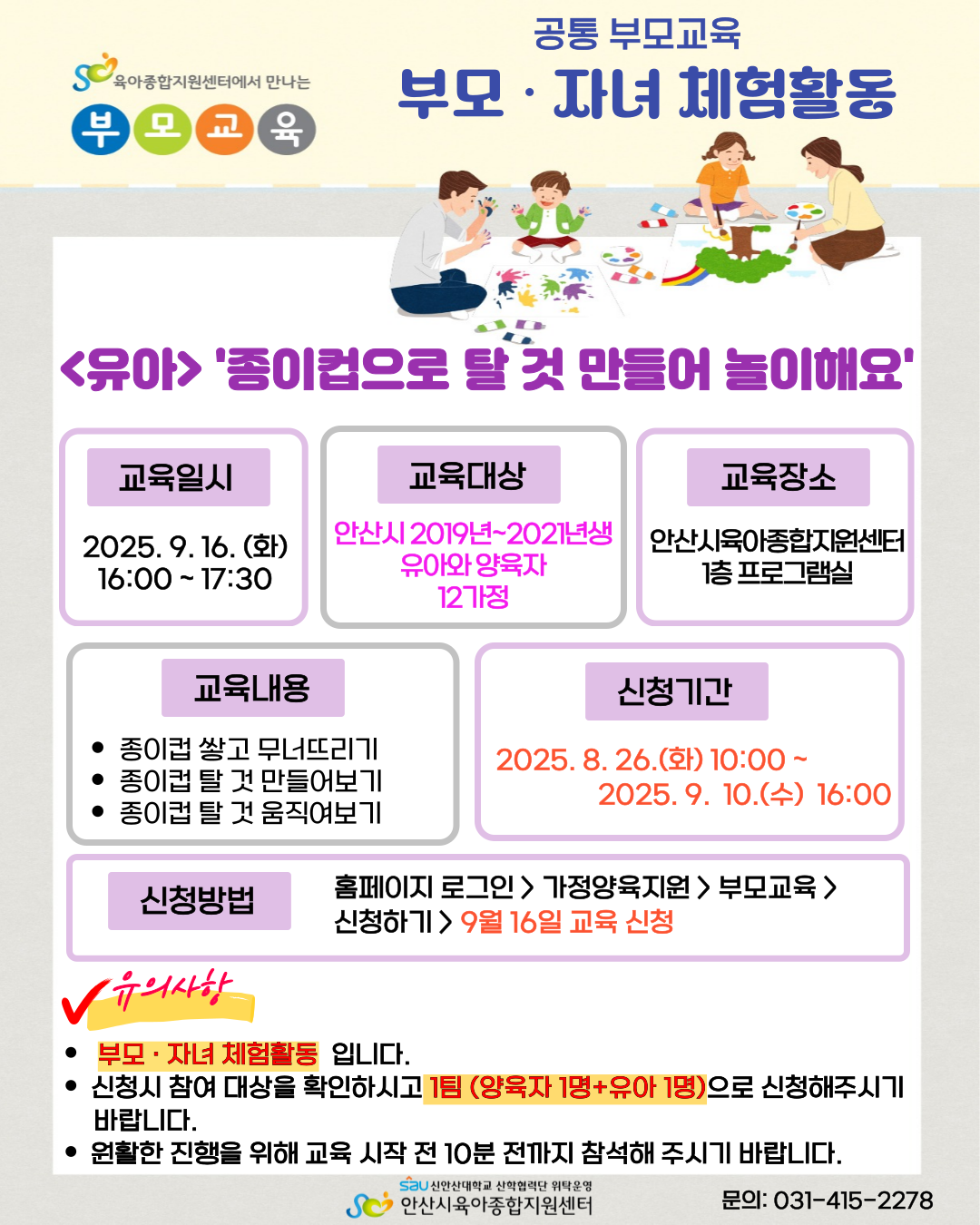 ※ 부모·자녀 체험활동으로 자녀 1명 + 양육자 1명으로 참여 가능하오니 참고바랍니다.