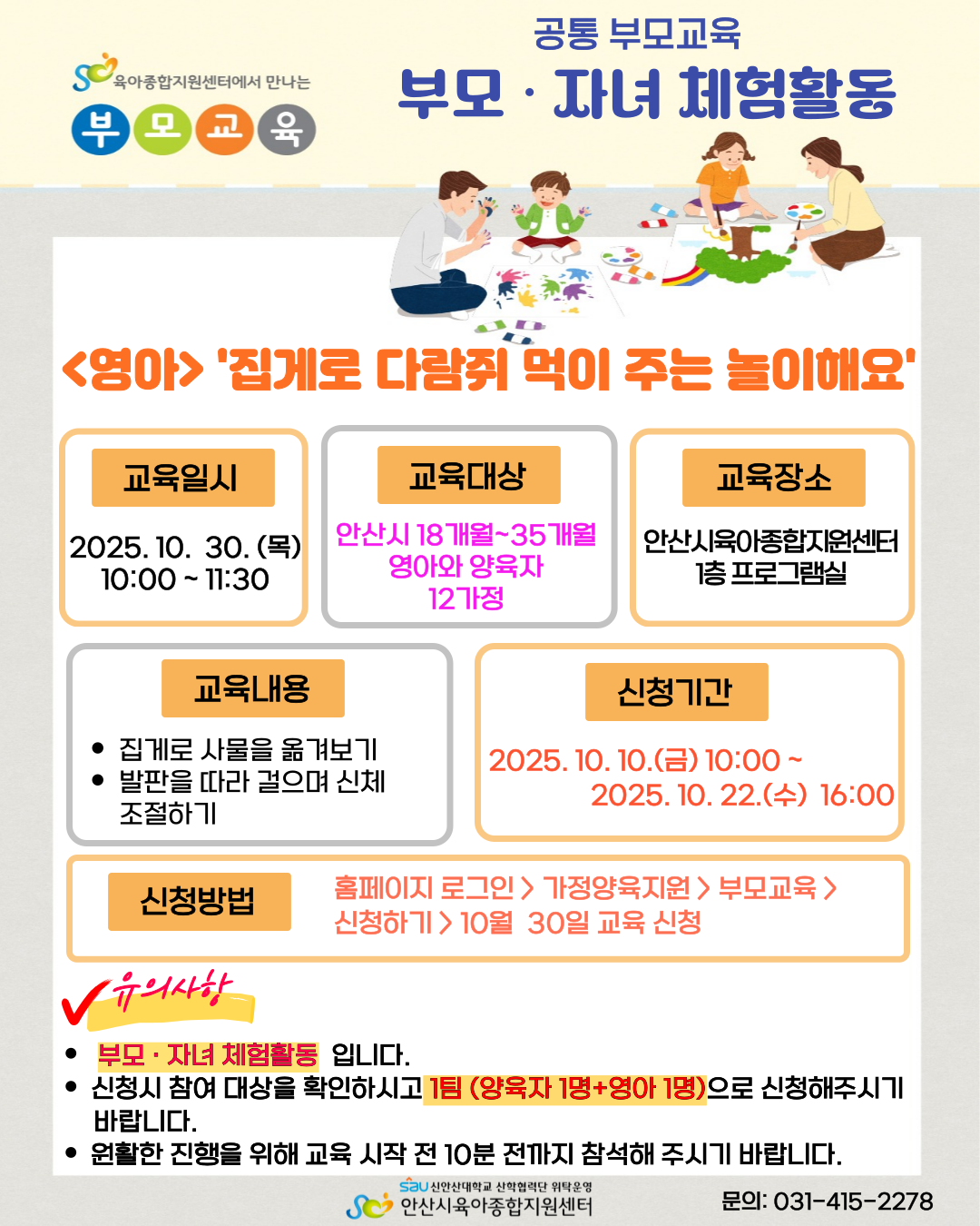 ※ 부모·자녀 체험활동으로 자녀 1명 + 양육자 1명으로 참여 가능하오니 참고바랍니다.