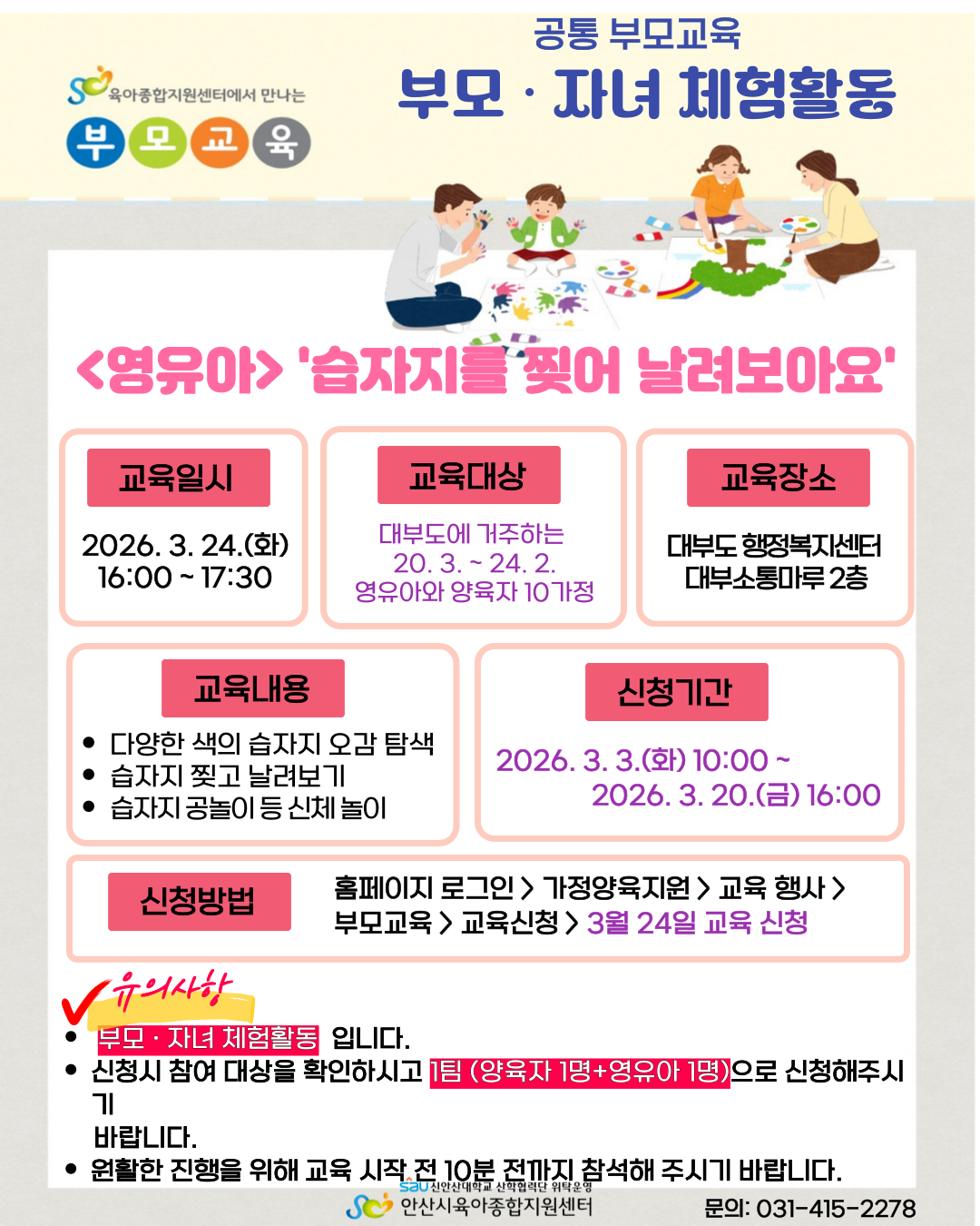 대부도에 거주하는 20. 3. ~ 24. 2. 해당하는 영유아와 양육자 10가정