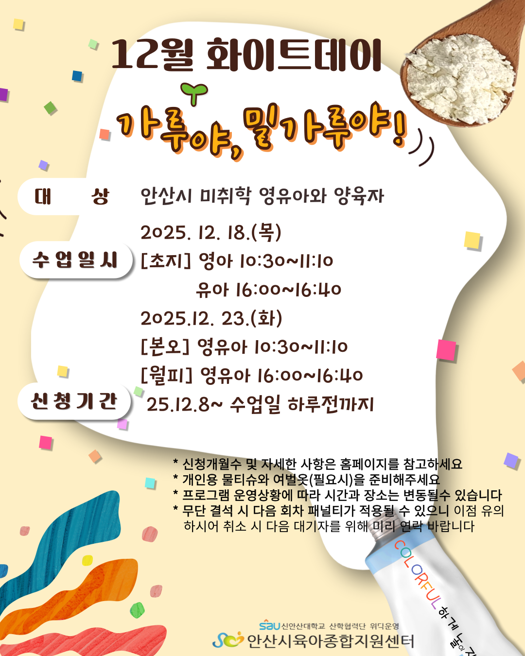 2025년에는 '컬러풀데이'라는 주제를 통해 활동을 하게 되며 12월은 화이트데이로 '가루야, 밀가루야' 활동이 계획되어 있습니다.