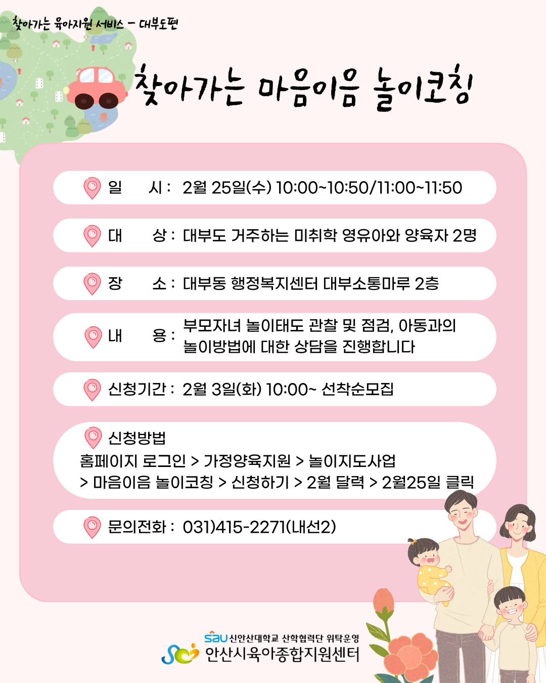 안산시육아종합지원센터에서 '찾아가는 육아지원 서비스'가 시작됩니다.
