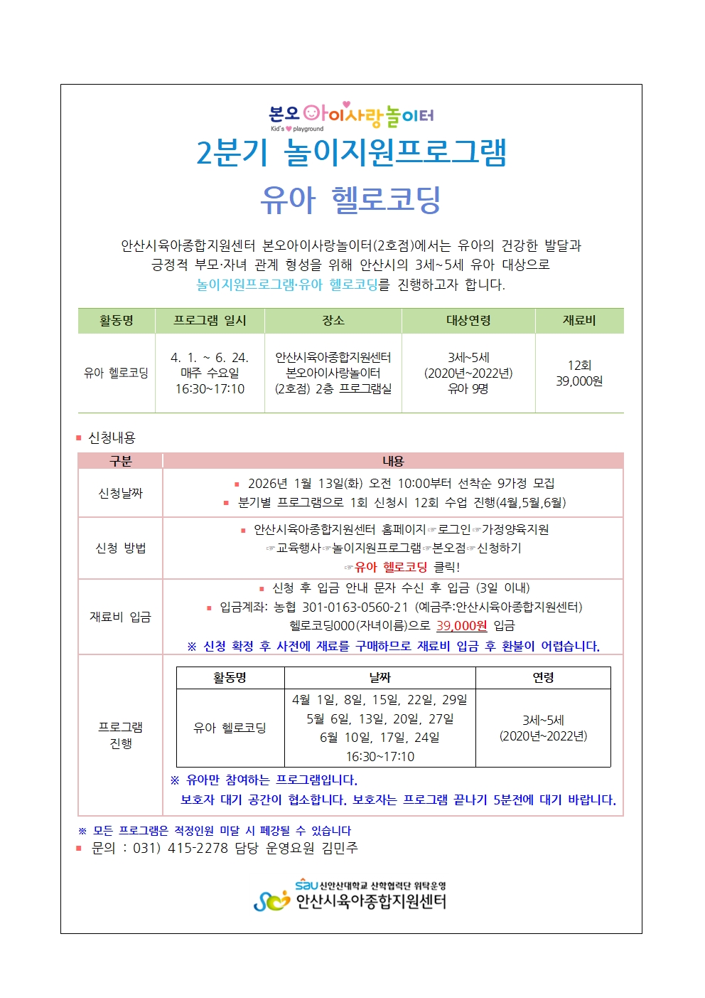 입금계좌 농협 301-0163-0560-21 안산시육아종합지원센터