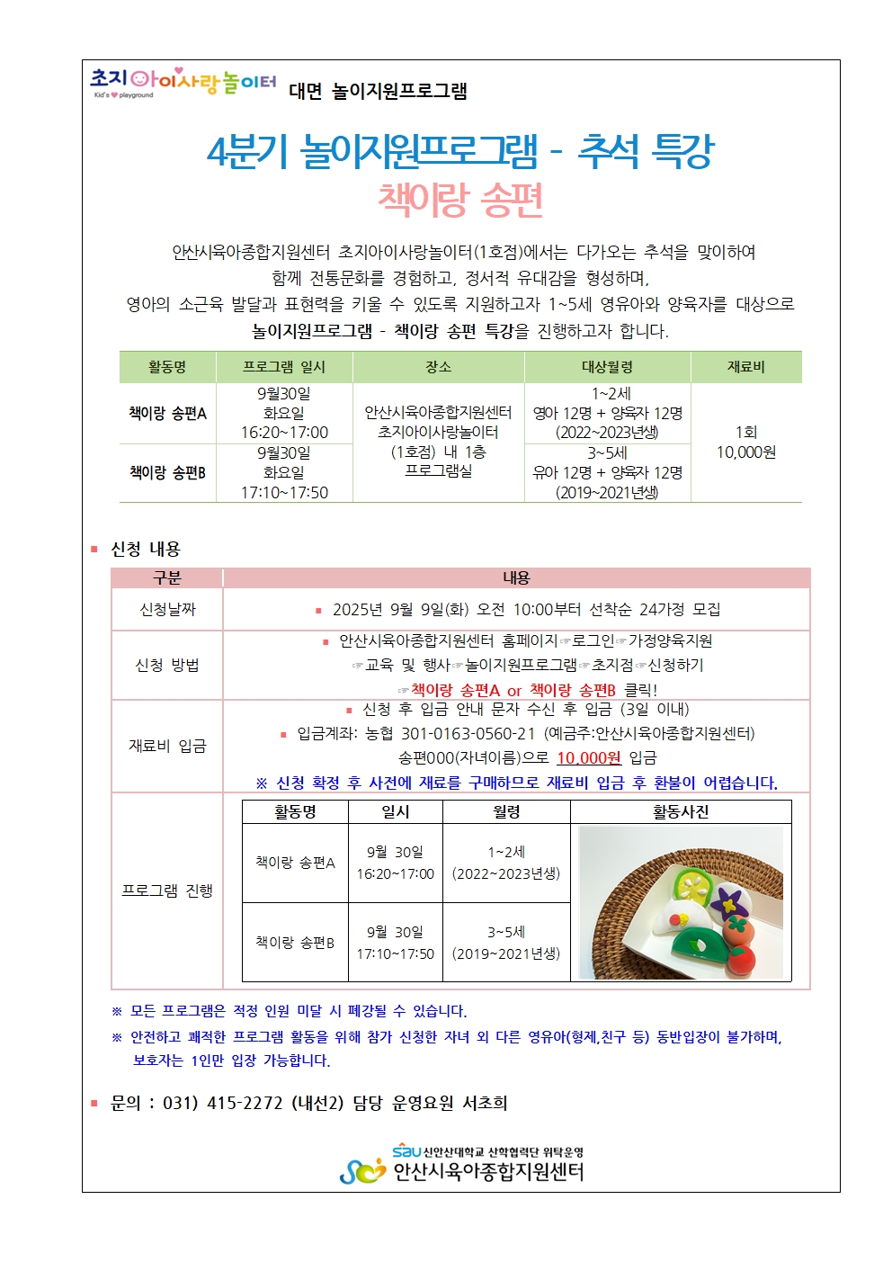 * 초지아이사랑놀이터(1호점)에서 대면으로 진행되오니 우측의 유의사항을 잘 읽어보시고 신청해주시기 바랍니다. *